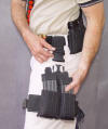 One of our New Products Introduced in 2002. It was originally design for use with the BIG .308 Magazine Pouches to help distribute the weight. But now it has become a standard for all rifle shooters. It helps over come the problem of not having enough space on your belt to accommodate all the gear necessary to shoot a typical 3 Gun Stage. When we first started shooting our Rifle magazine pouches ended up in the small of our back as that was the only place left to put them. When the small wasted shooters tried to get their gear set up they just didn't have enough space. One could call this a waist extender.....its a great device it works with 9mm carbine pouches and .308 pouches.
